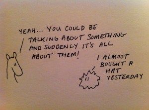 Sound a little familiar? What’s neat about the article is that sociologist Charles Derber (whose book The Pursuit of Attention inspires much of the piece) has deconstructed some of the ways people masterfully – and subtly – monopolize the conversation back to ego numero uno.
