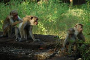 I spent the morning sitting on the grass near the mouse deer, gently corralling him when he strayed too far. He was a pretty plucky little guy, not even a half hour had passed when he ventured unsteadily on his tiny legs to see what I was all about before nestling back into the security of his shrub. At one point, a bunch of toque monkeys came close, curious to see what I was looking at. I instantly picked him up and shielded him – he didn’t struggle or protest and seemed quite content to sit with me afterward. I knew right then that this encounter was something special.