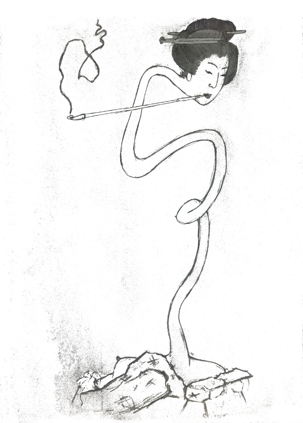 It’s also cool to see how he echoed the curve of her neck with the smoke from the pipe. I didn’t see any reference to pipe-smoking rokurokubi, so I’m a bit suspicious of the inclusion of that in his drawing although apparently there wouldn’t have been much opium in Japan during his time.