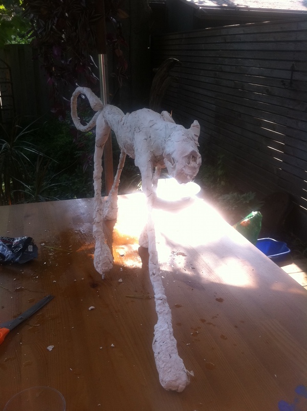 A few days ago I posted a paperclay and wire sculpture in progress, here a few snaps of the finished piece. He’s an indoor AND outdoor cat. 🙂