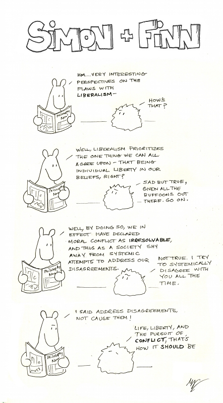 The following cartoon accompanied the print version of Francisco Uribe’s article “The Paradox of Liberalism” (Philosophy Now, Issue 110). In this article, the writer discusses why the rise of fundamentalism poses particular challenges for liberalism given the latter’s core tenet that individuals should be able to act as they see fit…