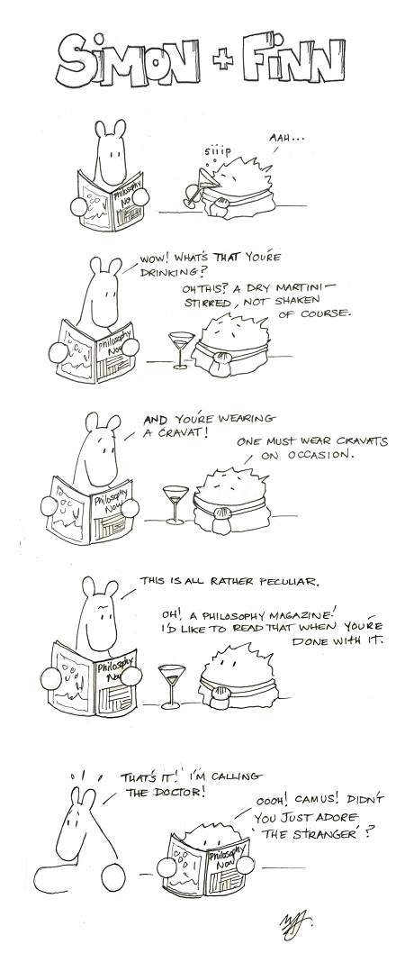 The following cartoon accompanied the print version of Robin Small’s piece on philosophy annnd – wait for it – cocktails! (“Philosophy & Cocktails” Issue 113 of Philosophy Now). In this delightful article the author explores the equally valid contribution cocktails have made to late night philosophical discussion, traditionally considered the primary purview of wine. For some easy reading on the subject, take a look at HuffPost’s New York Cocktail Philosophy: http://www.huffingtonpost.com/skye-cleary/new-york-cocktail-philoso_b_7827076.htmlS&F Martini 300dpi web