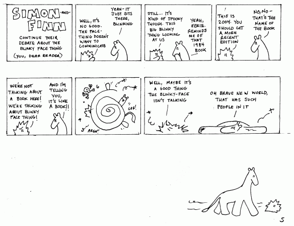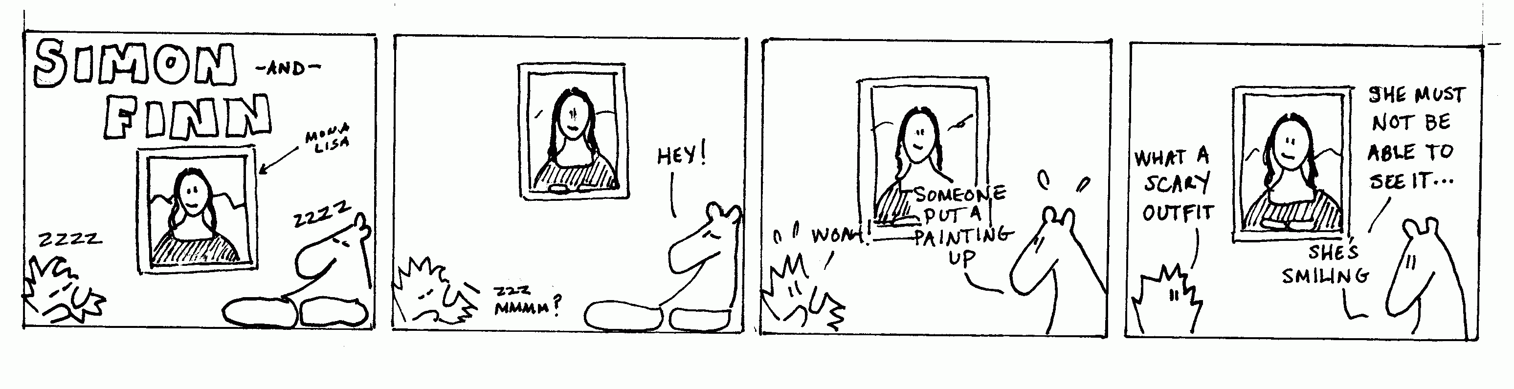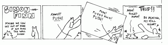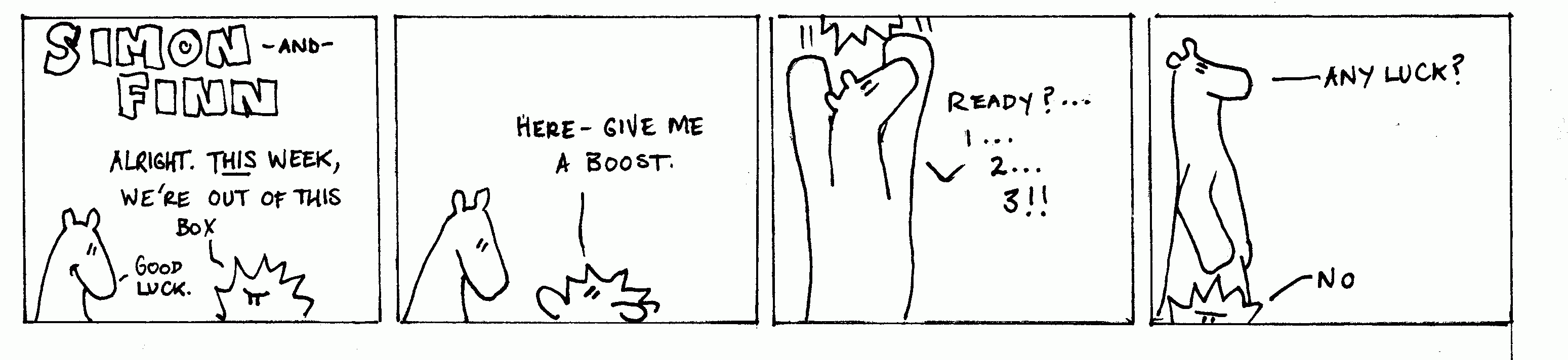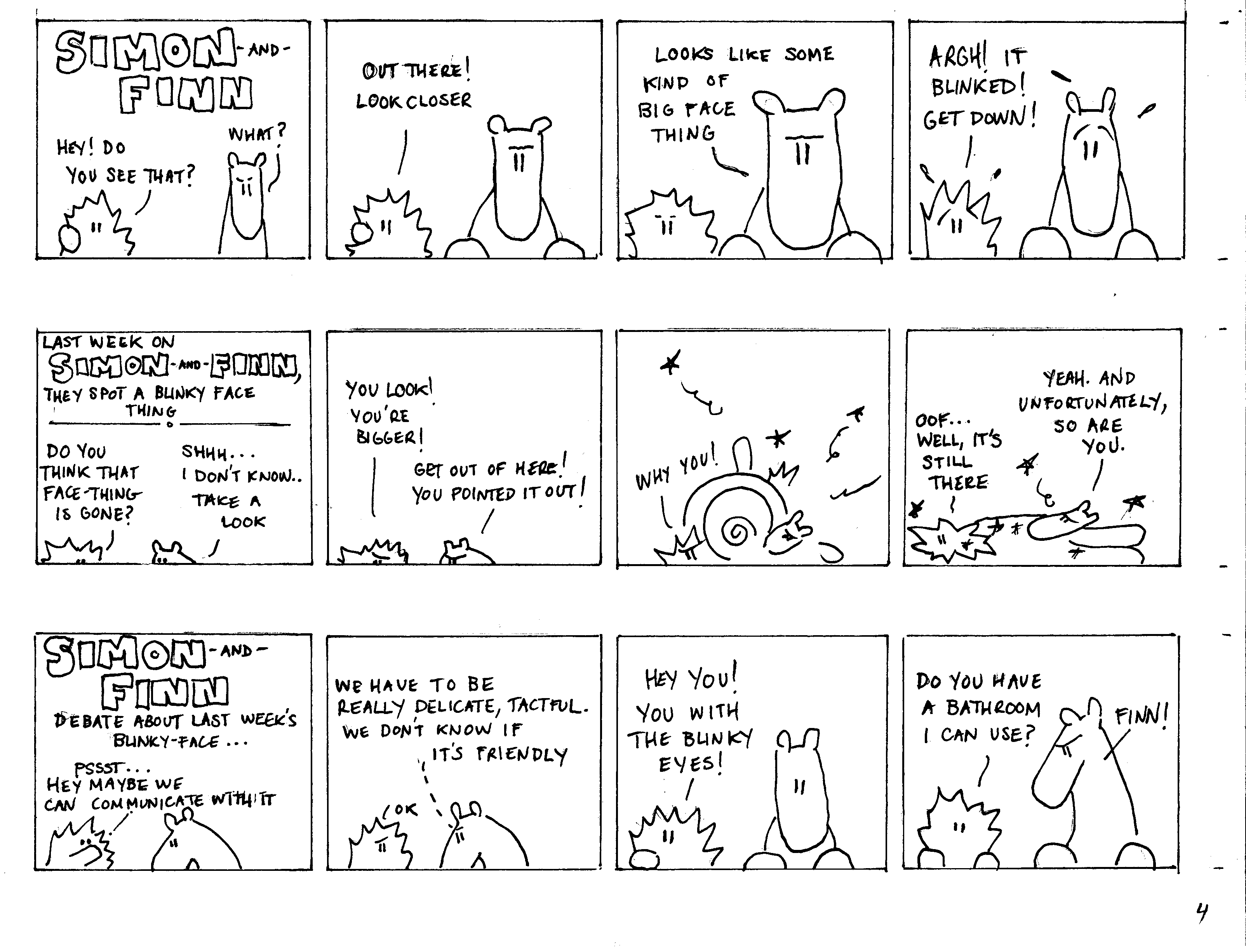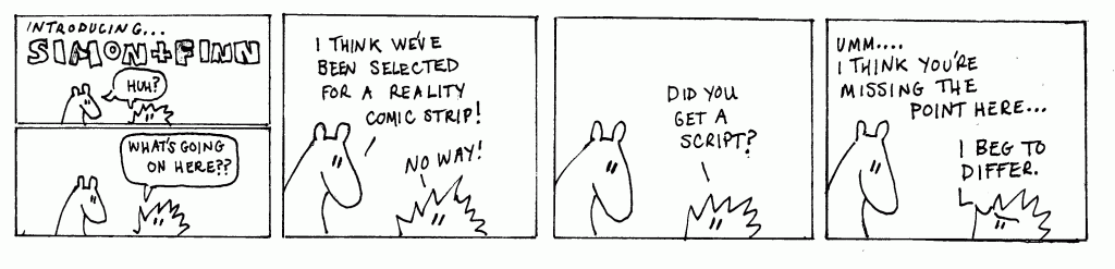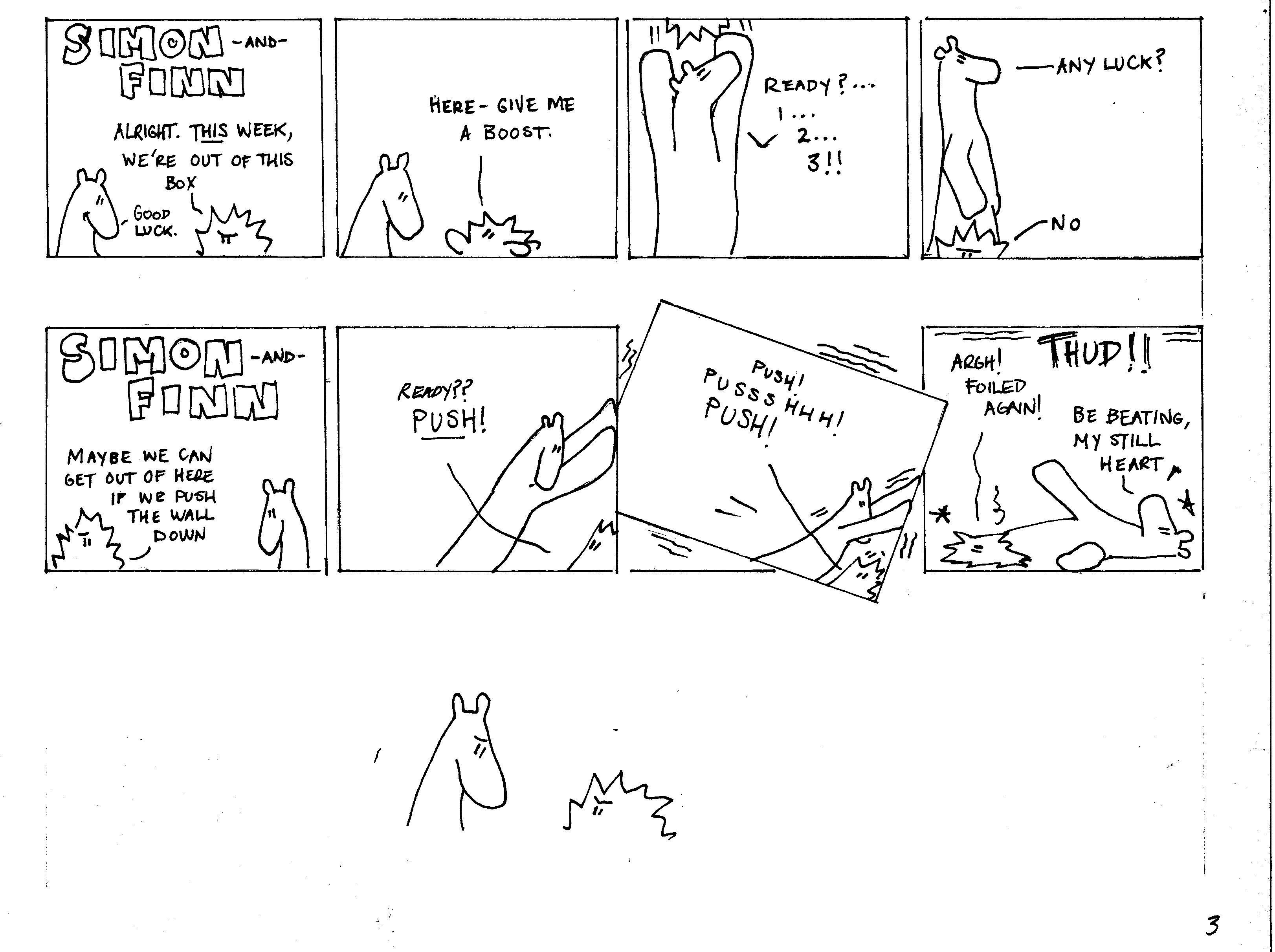 Here’s a few more.. this was kind of ‘beta-concept’ Simon & Finn as I was thinking of newspaper strips at the time. I sent a few off to some syndicates, but gave up after showing them to my mom. I think she was calculating the cost of putting me through school only to end up with some weird cartoons.