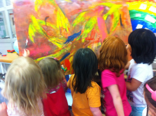 The interesting thing is that the large painting wasn’t quite coming together until they started helping and working with tools and ideas I hadn’t even considered. Check out these tiny little hands doing incredible stuff! Some of them were even jumping to reach the top of the canvas – we decided then that this was dynamic painting in its most literal iteration. 🙂