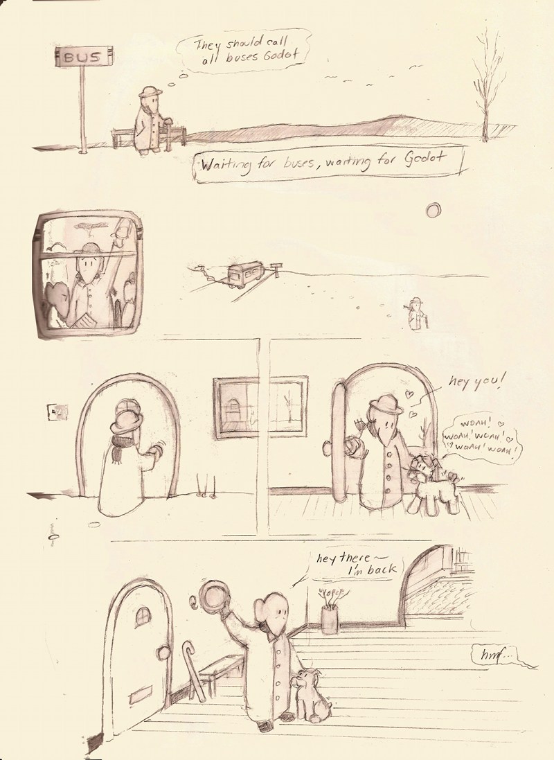 I’ve been working on a story for some time now and have been trying out a few formats and styles. The first version was wordless, and seeing as that didn’t work out so well, I’m trying my hand at including words. Here are a few draft pages, hopefully they aren’t too difficult to make out… I have a fraught relationship with my scanner as will no doubt become evident. Some of you may recognize the character from previous illustrated posts on Camus quotes. 🙂
