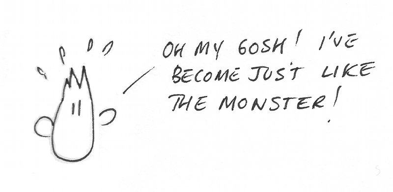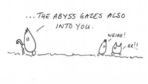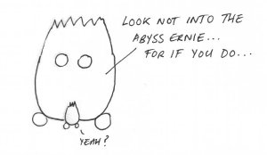 I don’t have the answer of course, but do think Nietszche’s abyss quote touches on the spiritual echo that can result from our choices. For a lighter take on this concept, feel free to check out a prior illustrated story, Ernie & The Nietzsche Monster.